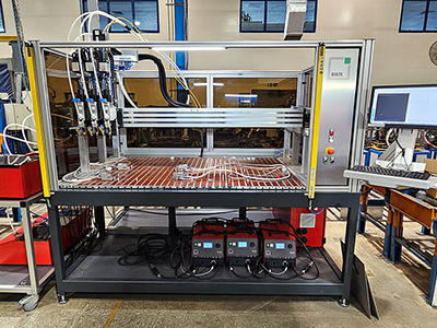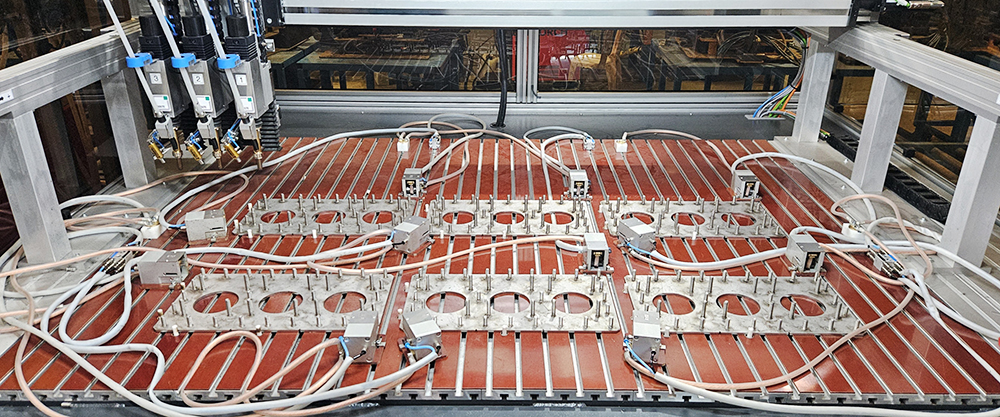 CNC-Bolzenschweißmaschine T1308025 (Arbeitsbereich: 1300 x 800 x 250 mm) mit drei Automatik-Schweißköpfen und sieben automatischen Bolzenzuführungen (mit Videos)
