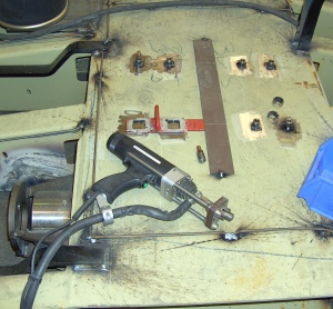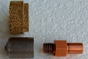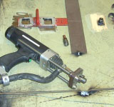 Wegen des ungünstigen Längen-/Durchmesserverhältnisses der Innengewindebuchse wird ein Bolzenhalter-Adapter zur Übertragung des hohen Schweißstroms verwendet.