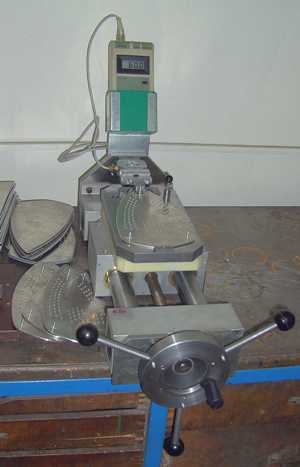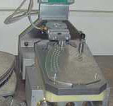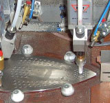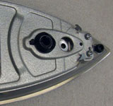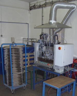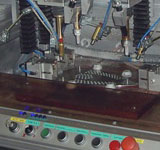 Aufspannvorrichtung mit eingelegter Bügeleisensohle und Schweißköpfen (mit Flüssigkeitssprühvorrichtung) in Schweißposition