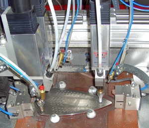 Die Bolzenschweißanlage ist ausgelegt zum Schweißen von drei Aluminiumstifen auf eine Bügeleisensohle. Die Aluminiumstifte dienen zur Befestigung der Heizeinheit an der Bügeleisensohle.