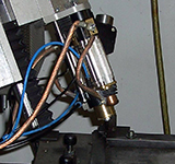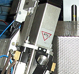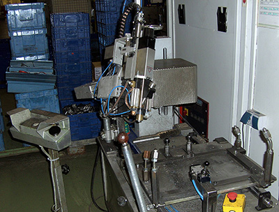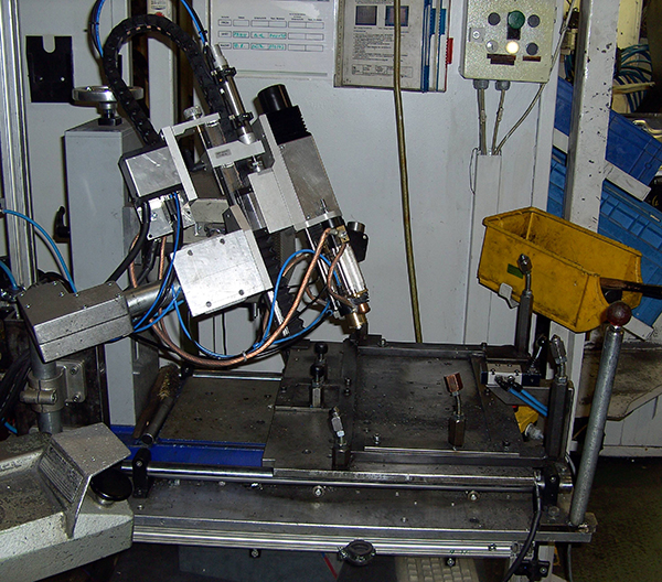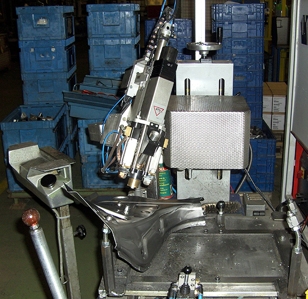 Tischschweißvorrichtung mit verschiebbarer Werkstückaufnahme, Automatik-Bolzenschweißkopf KHA-200F ausgerüstet mit integriertem Wegmesssystem, Schutzgasvorrichtung und Pneumatikzylinder zur Masseanbringung mit pneumatischem Arbeitshub AHP-080